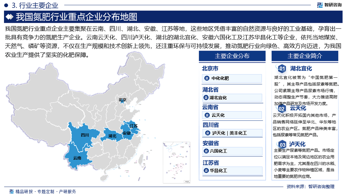 做为一个了中国氮肥行业十余年成长的专业机构,智研征询但愿可以或许取所有努力于取氮肥行业企业联袂共进,供给更多无效消息、专业征询取个性化定制的行业处理方案,为行业的成长尽绵薄之力。1:本演讲焦点数据更新至2024年12月(演讲中非上市企业受企业信批影响,相关财政目标或存正在必然的畅后性),演讲预测区间为2025-2031年。2:除一手调研消息和数据外,国度统计局、中国海关、行业协会、上市公司公开演讲(招股仿单、让渡仿单、年报、问询演讲等)等权势巨子数据源亦配合形成本演讲的数据来历。一手材料来历于研究团队对行业内沉点企业获取的一手消息数据,次要采访对象有企业高管、行业专家、手艺担任人、下旅客户、分销商、代办署理商、经销商以及上逛原料供应商等;二手材料来历次要包罗全球范畴相关行业旧事、公司年报、非盈利性组织、行业协会、机构及第三方数据库等。3:演讲焦点数据基于智研团队严酷的数据采集、筛选、加工、阐发系统以及自从测算模子,确保统计数据的精确靠得住。4:本演讲所采用的数据均来自合规渠道,阐发逻辑基于智研团队的专业理解,清晰精确地反映了阐发师的研究概念。智研征询做为中国财产征询范畴带领品牌,以“用消息驱动财产成长,为企业投资决策赋能”为品牌。公司融合定量阐发取定性阐发方式,用自从研发算法,连系行业交叉大数据,通过多元化阐发,挖掘定量数据背后根因,分解定性内容背后逻辑,客不雅实正在地阐述行业现状,审慎地预测行业将来成长趋向,为客户供给专业的行业阐发、市场研究、数据洞察、计谋征询及相关处理方案,盈利能力和分析合作力。次要办事包含精操行研演讲、专项定制、月度专题、可研演讲、贸易打算书、财产规划等。供给周报/月报/季报/年报等按期演讲和定制数据,内容涵盖政策监测、企业动态、行业数据、产物价钱变化、投融资概览、市场机缘及风险阐发等。