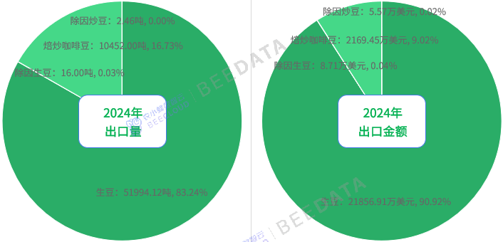 此中,咖啡生豆出口量及出口金额正在全国咖啡出口量及出口金额中所占的比沉别离为83。24%、90。92%。