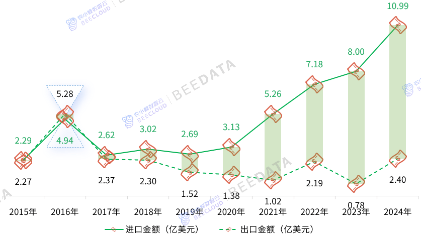 2015年至2024年,中国咖啡进口金额增加了8。7亿美元,增幅约为380。81%,年均复合增加率约为19。06%?。