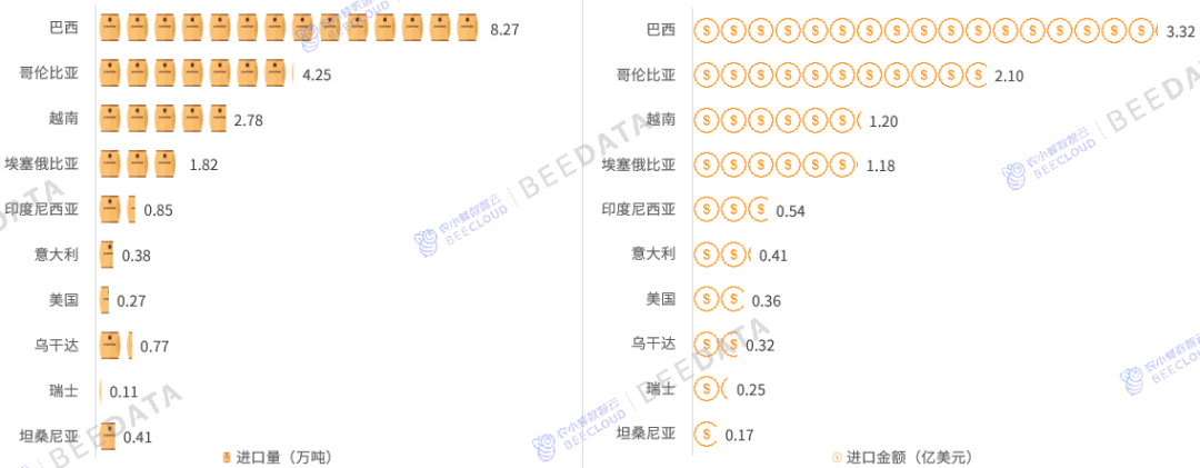 此中,中国从巴西进口的咖啡进口量及进口金额正在全国咖啡进口量及进口金额中所占的比沉别离为38。75%、30。25%。
