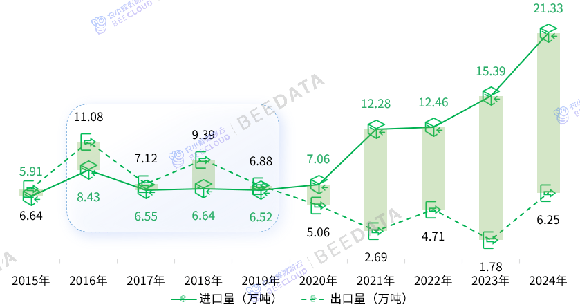 从进出口商业量来看,2015年至2024年,中国咖啡进口量增加了15。42万吨,增幅约为260。68%,年均复合增加率约为15。32%!