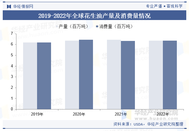 全球花生油行业供需根基均衡,按照美国农业部(USDA)数据,全球花生油产量从2019年的618万吨增加至2022年的637万吨,CAGR为1。01%;全球花生油消费量从2019年的619万吨增加至637万吨,CAGR为0。96%。