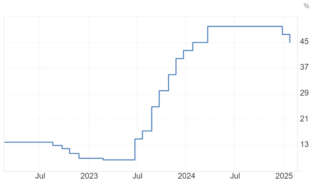 [2] 2023年5月,埃尔多安博得总统订定合同会选举后,以财务部长穆罕默德·希姆谢克(Mehmet Şimşek)和央行行长行长哈菲泽·盖伊·埃尔坎(Hafize Gaye Erkan)为代表的新一届内阁明白暗示将回归正统线,寻求愈加稳健并具备持久性的指点纲要。2023年6月进入加息周期后,土耳其央行(CBRT)持续九次加息,将基准利率共计上调4,150个基点至50%。行长法提赫·卡拉汉带领的土耳其央行货泉政策委员会(MPC)持续八次会议维持利率不变。